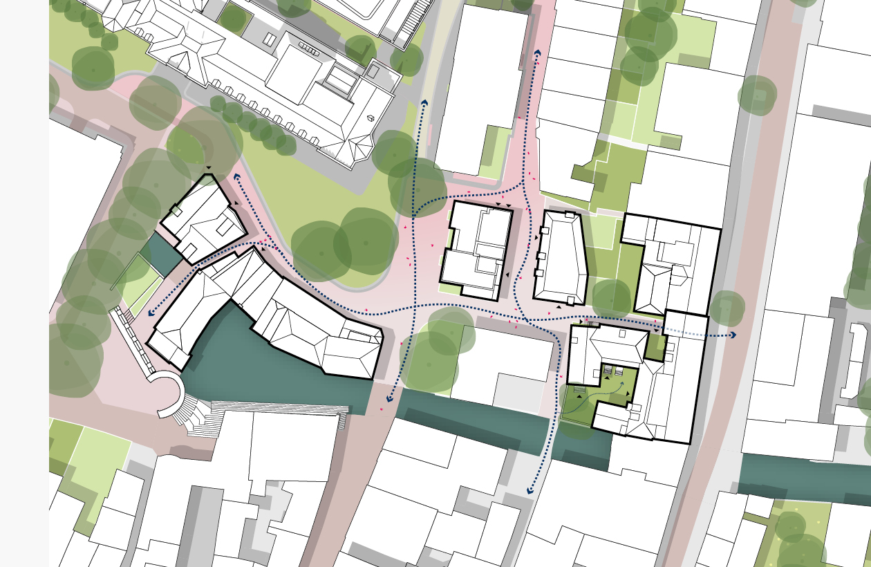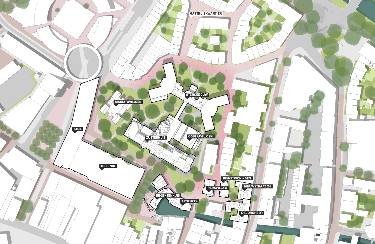 Door het gebied te verbinden met de historische binnenstad door een reeks nieuwe en oude voetgangersstraten, poorten, stegen en bruggen sluit het naadloos aan bij de historische binnenstad. Er ontstaat een intiem zwerfgebied tussen monumenten, vrijstaande gebouwen, de (opengemaakte) Dieze en de historische Gasthuispoort. De sluitsteen van het gebied is de aantakking aan de Markt; de herontwikkeling van Stoa en Tolbruggarage.