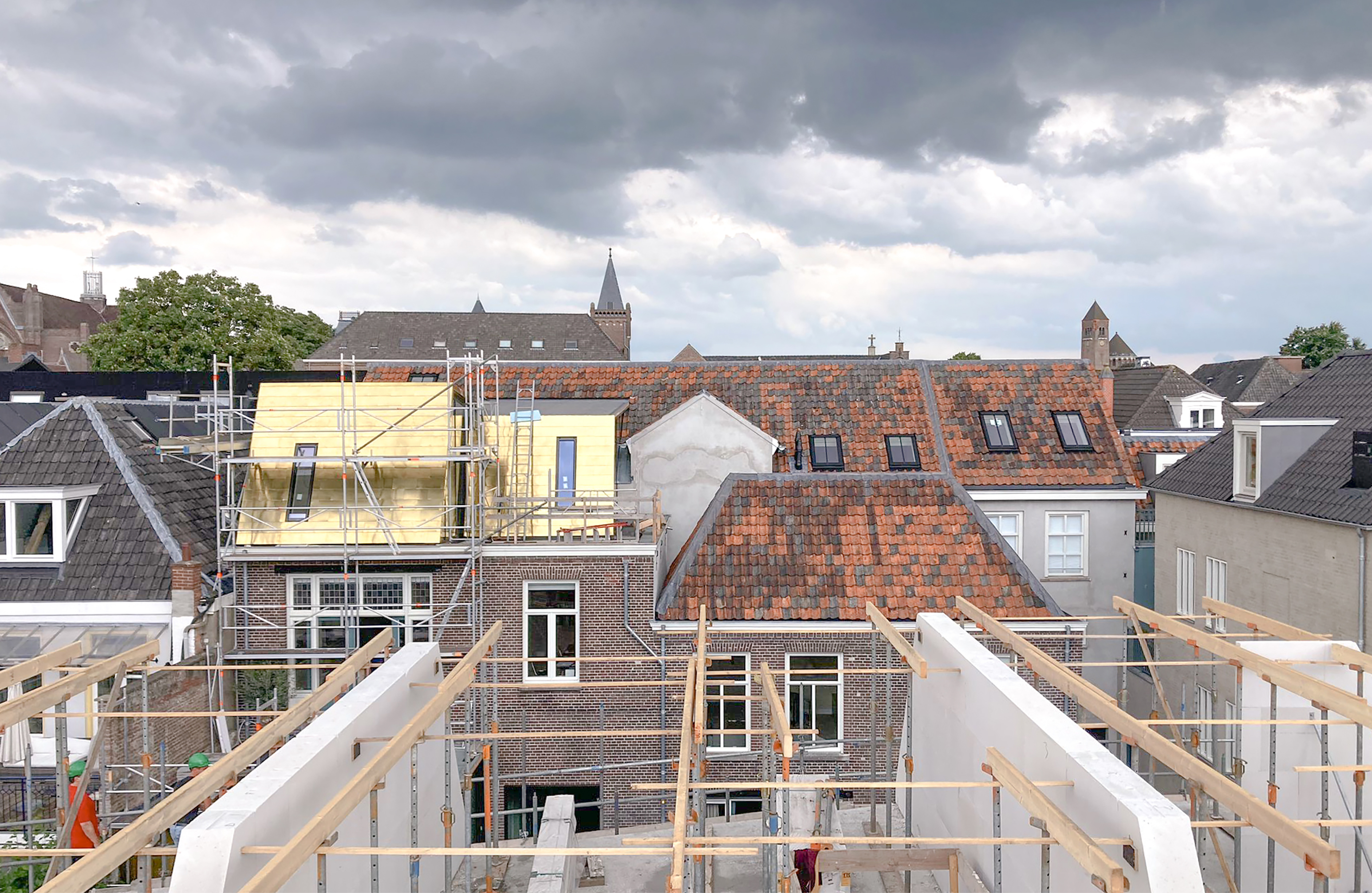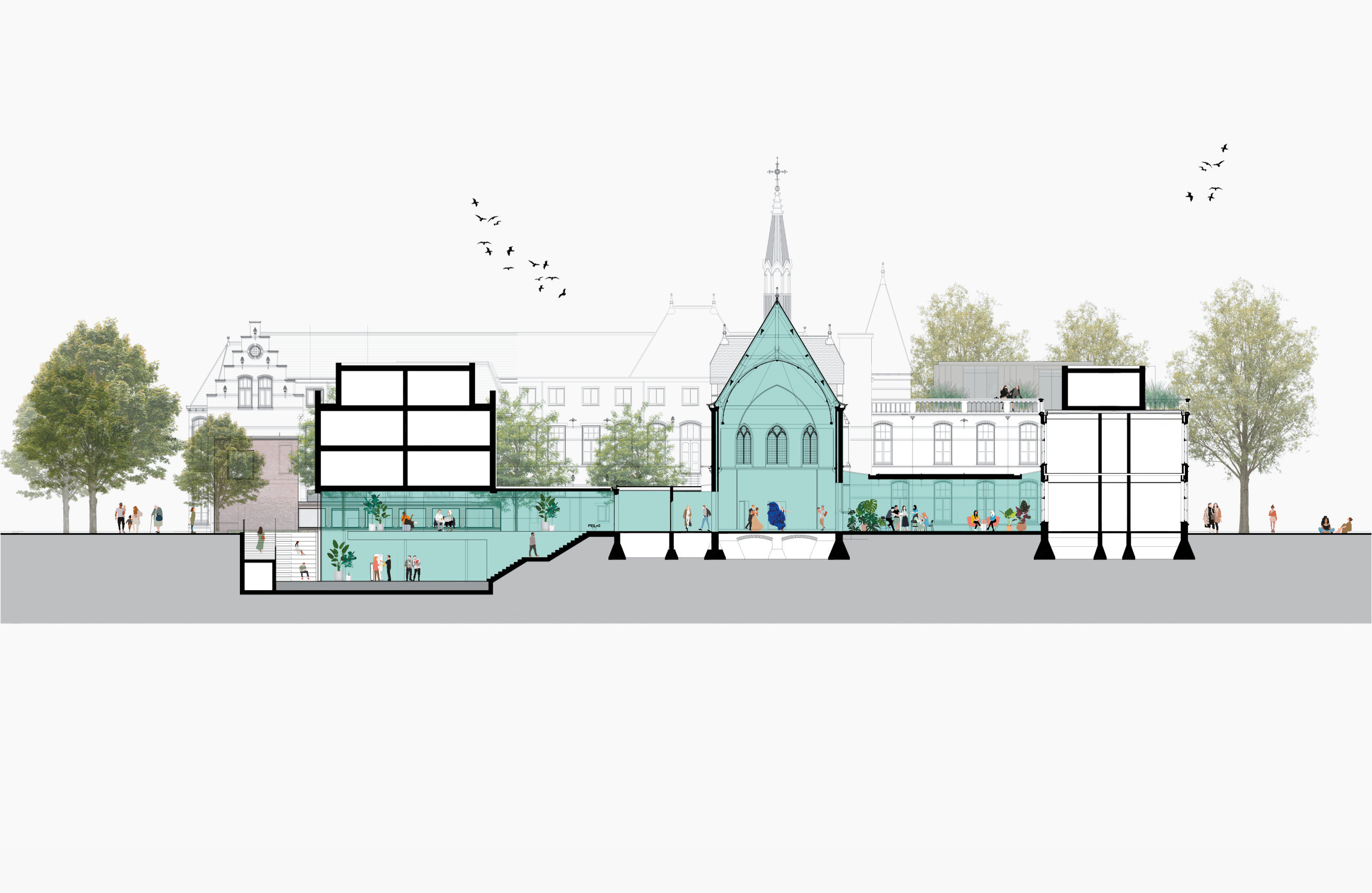 Het masterplan voor het totale Gasthuiskwartier, door West 8 ontworpen, biedt naast bestaande monumenten ruimte voor nieuwbouw. Het ensemble van oude en nieuwe structuren langs de Dieze wordt de ‘dronkenzeemansverkaveling’ genoemd. Bezoekers van het gebied worden elke keer opnieuw verrast doordat straten niet doorlopen maar verspringen. We versterken deze ervaring door de nieuwe gebouwen zo te draaien, te plaatsen en te vormen dat een voetganger om de hoek wordt geleid. Hier wordt de bijzondere intieme Bossche stegenstructuur nog eens op een subtiele manier vorm gegeven.